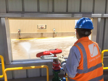 Descargar información técnicaLos cañones de agua MAGNUM son de operación manual, trabajan a una presión de 100 psig y flujo de 550 l/min con una boquilla de ¾”. Se instalaron 5 a cada lado de la bahía, dos en la parte inferior y dos en la parte superior para dar buena cobertura de lavado a los camiones.