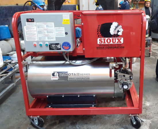 El equipo, modelo H5D3000 con caldero diésel, tiene una capacidad de 4.8 gpm a 2600 psi de agua fría y de agua caliente a 200°F (93 °C), y 2.6 gpm a 500 psi de vapor a 320 °F (160 °C). La bomba de agua es accionada por un motor eléctrico de 10 HP TEFC, 1750 rpm.