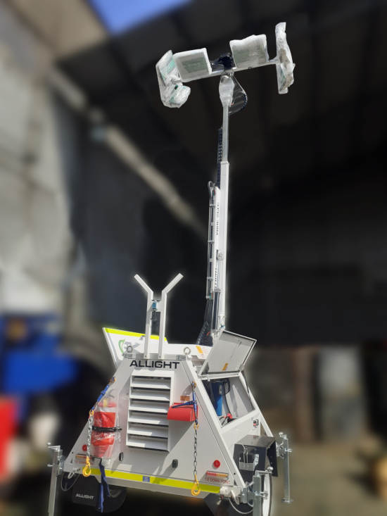 La torre es remolcable, de accionamiento hidráulico (mástil e inclinación de las luces), con mástil extensible hasta 9 m de altura y accionada con motor diesel marca Perkins 402D-05 de 2 cilindros, con tanque de combustible de 300 lt (79 gal).
