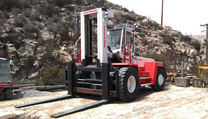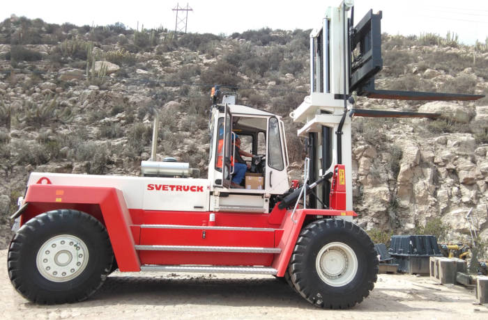 Descargar información técnicaEl montacargas industrial, fabricado por nuestra representada SVETRUCK de Suecia, tiene una capacidad de carga de 33,000 kg a 1200 mm de centro de carga, cuenta con un mástil doble de 4000 mm de altura de levante, desplazamiento lateral (sideshift) y sistema de liberación rápida.