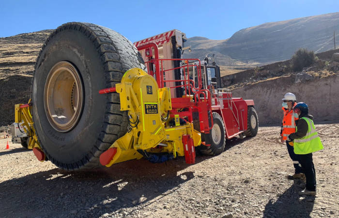 Se hizo entrega de un manipulador de neumáticos FMA modelo SVTH-6000 fabricado por nuestra representada FMA Industrial de Chile, a la minera Las Bambas. El manipulador de neumáticos se suministró instalado en un montacargas Svetruck modelo 42120-57 de 42 TM de capacidad, especialmente diseñado para trabajar en altura. La instalación del manipulador en el montacargas fue realizada por técnicos de Energotec y FMA.