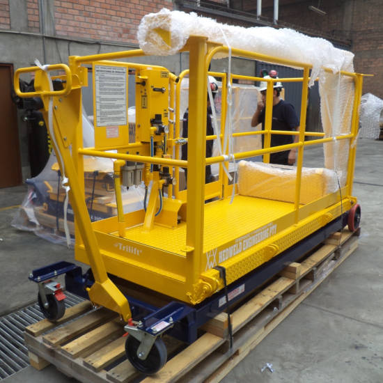 Descargar información técnicaLa plataforma tiene un sistema de elevación tipo tijera con pistones hidráulicos accionados por una bomba neumática. Cuenta con una caja adherible para herramientas y materiales, conectores en la plataforma para acoplar herramientas neumáticas, indicador de inclinación y ruedas giratorias frontales con bloqueo.